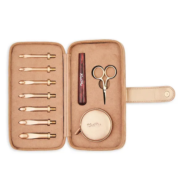 O Oasis Chunky Interchangeable Crochet Hook set contém 7 agulhas de crochê intercambiáveis em tamanhos – 5,5-10 mm com um cabo de madeira rosa e acessórios embalados em uma caixa de tecido de camurça falsa bege premium.